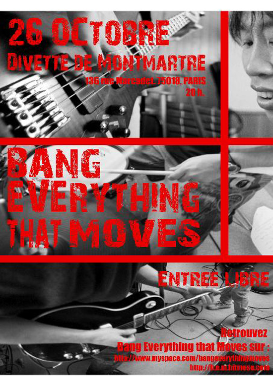 is playing tonight (Fete de la musique) at 7.30 with new « Bang Everything » (+bands: Feedz, Cben-Banette Morgane, & Franka) at Le Refuge 72 rue Lamarck, 18eme, metro Lamarck Caulaincourt.
